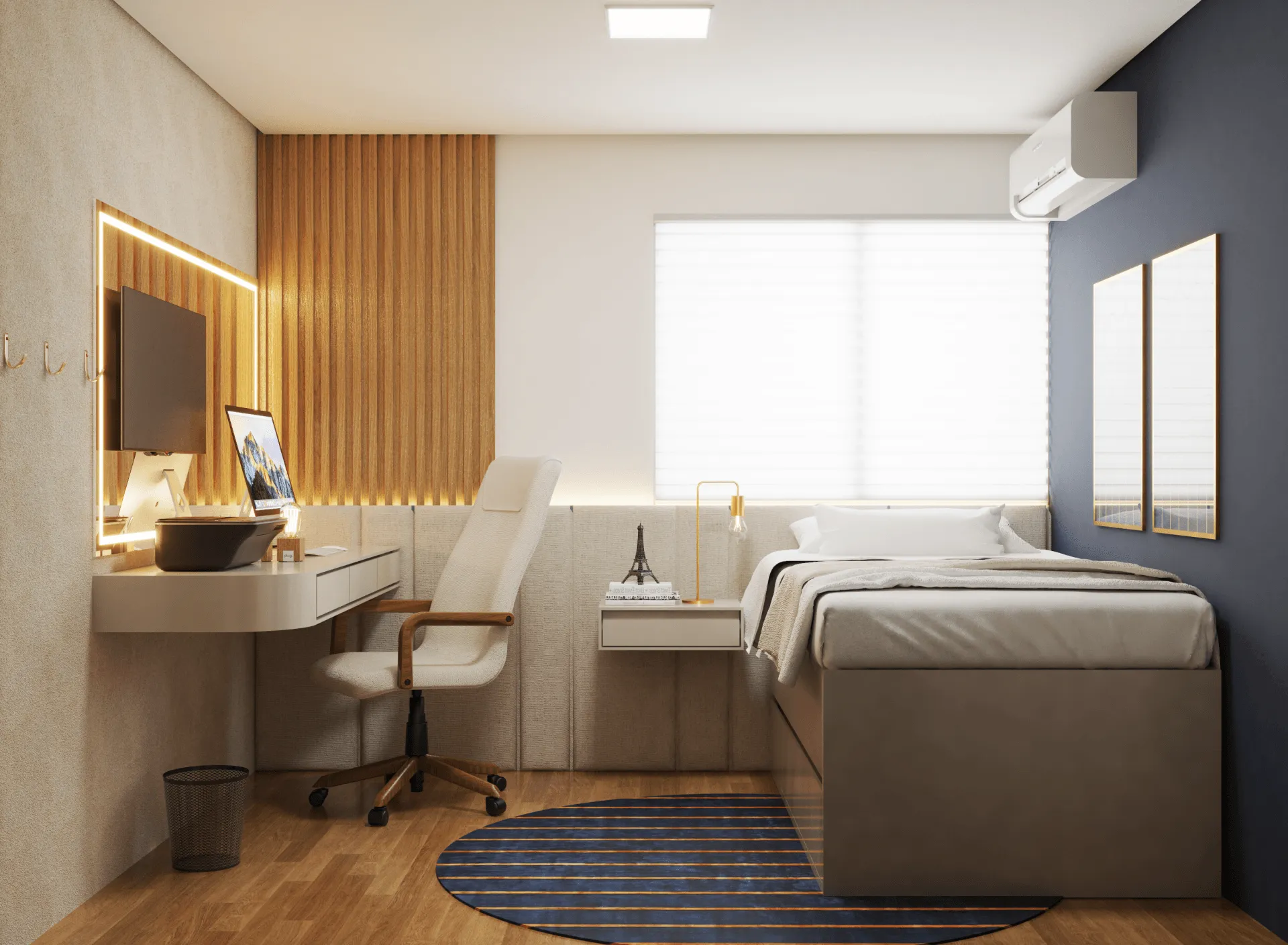 As cores claras trazem referência à delicadeza e o conforto que buscamos atingir. Juntamente com a composição de mobiliários e a decoração, criamos um ambiente ainda mais agradável.